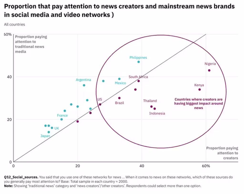 In South Africa, for example, Facebook, YouTube and X users still pay more attention to traditional news media and journalists than news creators and influencers.