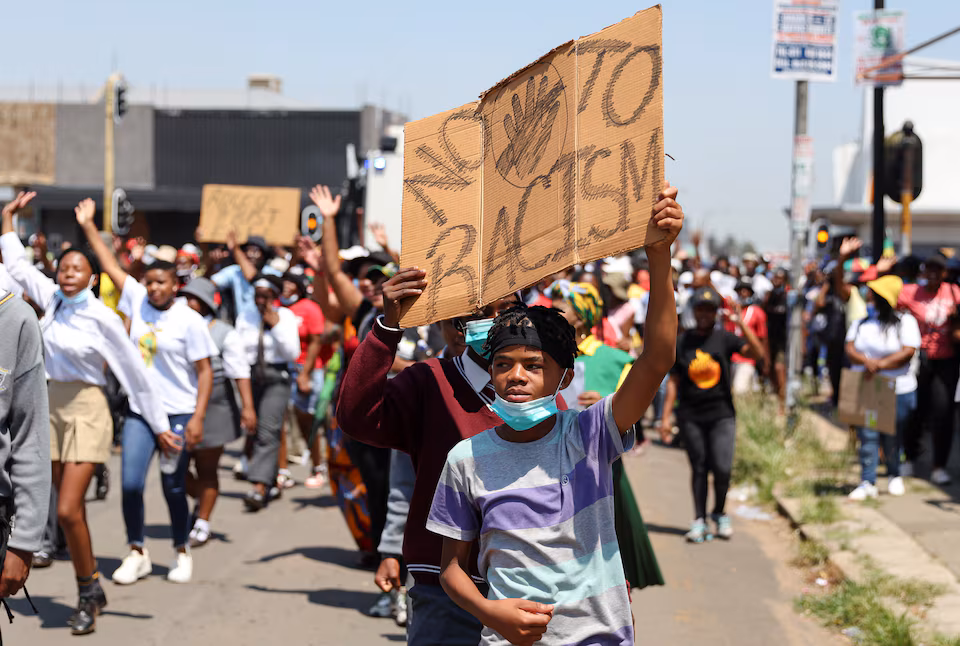 Students hold placards outside a school after tensions ran high when parents of schoolchildren at Hoerskool Jan Viljoen allegedly stood divided across racial lines over allegations of racism, in Randfontein, west of Johannesburg, South Africa, February 14, 2022. REUTERS/Siphiwe Sibeko